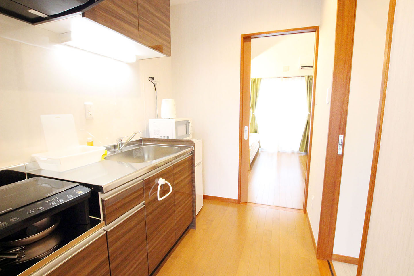 コンパクトながらも使い勝手のよいキッチンには、滞在時に便利な電子レンジや冷蔵庫、IHクッカーなど、便利な設備がございます。洗濯機やガス乾燥機など、長期滞在に便利な設備も充実しています。